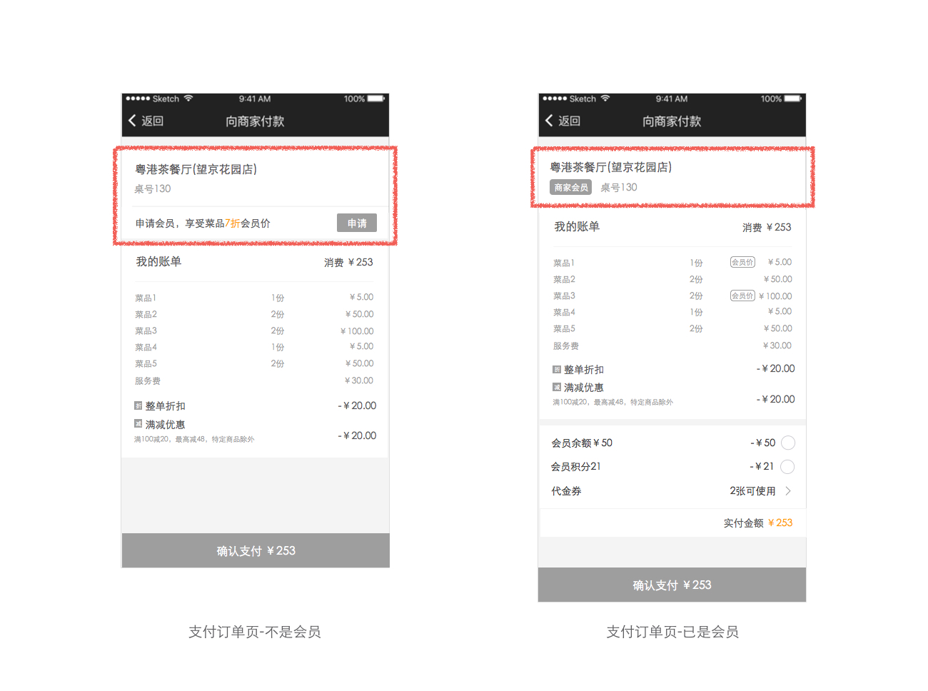 這里的一致性體現(xiàn)在前后頁(yè)面會(huì)員模塊的位置上,都位于頁(yè)面的頭部,與商家信息在一塊兒。原因是,顧客從商家信息下方的申請(qǐng)入口完成申請(qǐng)流程后,重新進(jìn)入支付訂單頁(yè)時(shí),想確認(rèn)自己是否已是會(huì)員,這時(shí),根據(jù)之前已有的認(rèn)知,會(huì)先入為主地從頭部的商家信息附近開始尋找,故將會(huì)員標(biāo)識(shí)也與商家信息放一塊兒,與用戶的認(rèn)知保持一致。