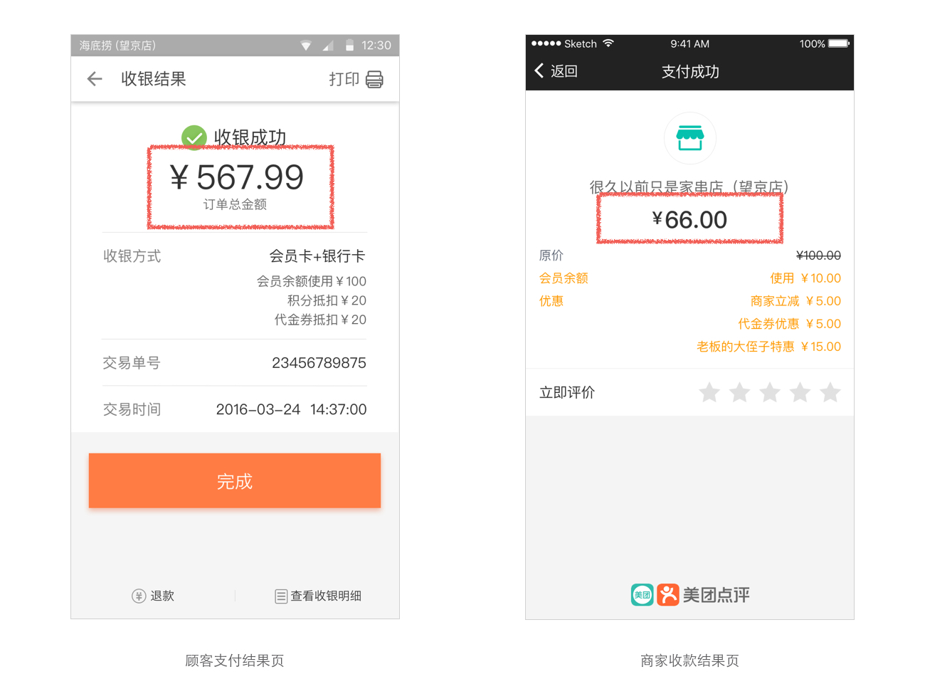 這里的不一致體現(xiàn)在頁(yè)面頭部重點(diǎn)展示的金額上。大家一定會(huì)疑問,同一筆消費(fèi)的支付結(jié)果頁(yè),為什么要展示不一樣的金額呢?同樣的金額難道不也會(huì)讓顧客和商家達(dá)成某種一致嗎?通過詢問商家的想法發(fā)現(xiàn),商家更關(guān)注訂單的總金額,因?yàn)檫@才是他們實(shí)際得到的收益,并且在對(duì)賬時(shí)也需要訂單總金額才能對(duì)平。反觀顧客,作為注重優(yōu)惠的消費(fèi)者自然更在意自已實(shí)際付了多少,有沒有多付或者少付,并且,顯示減去各種優(yōu)惠的實(shí)付金額,在心理感受上也有撈了大便宜的快感。由此可見,一致性在這里,并沒有認(rèn)知上的重合,也就沒有必要遵循了。