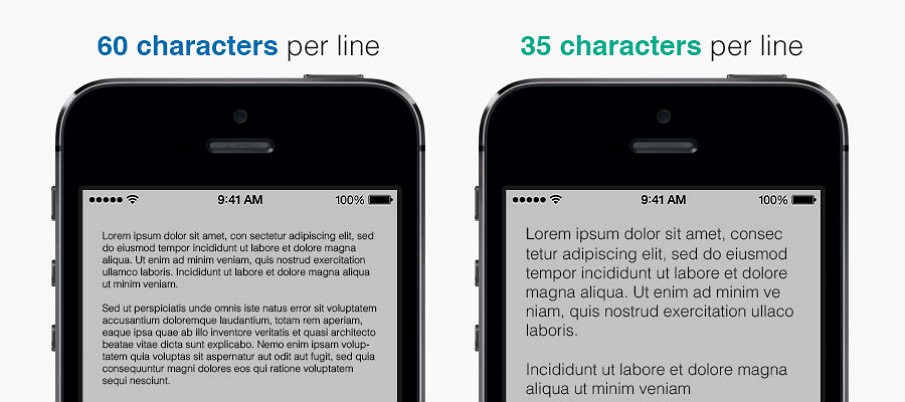 行長(zhǎng)也是手機(jī)排版中的一個(gè)重要尺度要求。文本行的長(zhǎng)度可能會(huì)影響整個(gè)排版。桌面屏幕的行長(zhǎng)勢(shì)必會(huì)超出手機(jī)屏幕邊框。在手機(jī)排版中,每行上的字符數(shù)量,字體大小和行長(zhǎng)度都緊密相連,互相影響和牽制。合理的布局這些要素是可讀性的關(guān)鍵。通常,一行保留30- 40 個(gè)字符數(shù)時(shí)比較合理的選擇。