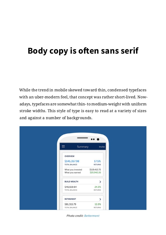 同一款app或系統(tǒng),建議使用單個(gè)字型并演變幾種不同字體變體和不同尺寸。混合幾個(gè)不同的字型會(huì)使您的界面看起來(lái)分散和混亂。通常,品牌或應(yīng)用程序擁有自己的預(yù)設(shè)字型。蘋(píng)果使用San Francisco, 諾基亞使用Nokia Pure,Google Android使用Roboto。