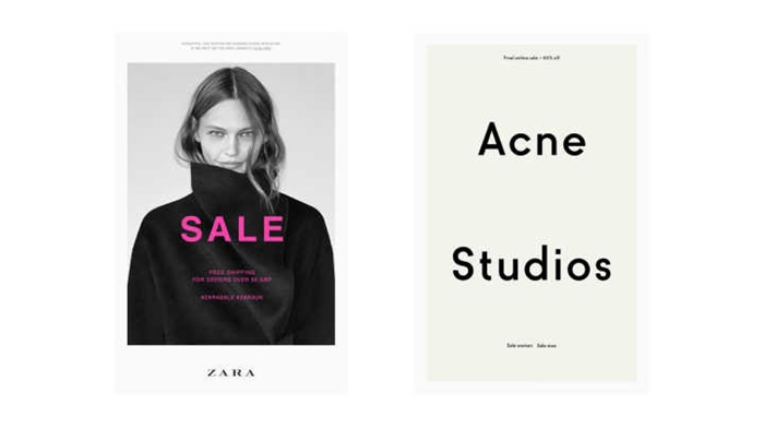 下圖中的兩張海報,同樣是服裝品牌,同樣是簡約風(fēng)格,同樣是促銷海報,看看Zara與Acne Studios是怎么做的。如果只看促銷效果,哪張海報的促銷效果會更好呢?
