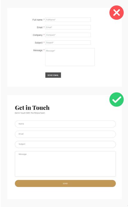 留言表單切忌太多填寫(xiě)項(xiàng),通常3- 6 個(gè)就夠了,比如姓名、郵箱、手機(jī)號(hào)碼、留言內(nèi)容等。用星號(hào)區(qū)分必填或選填。