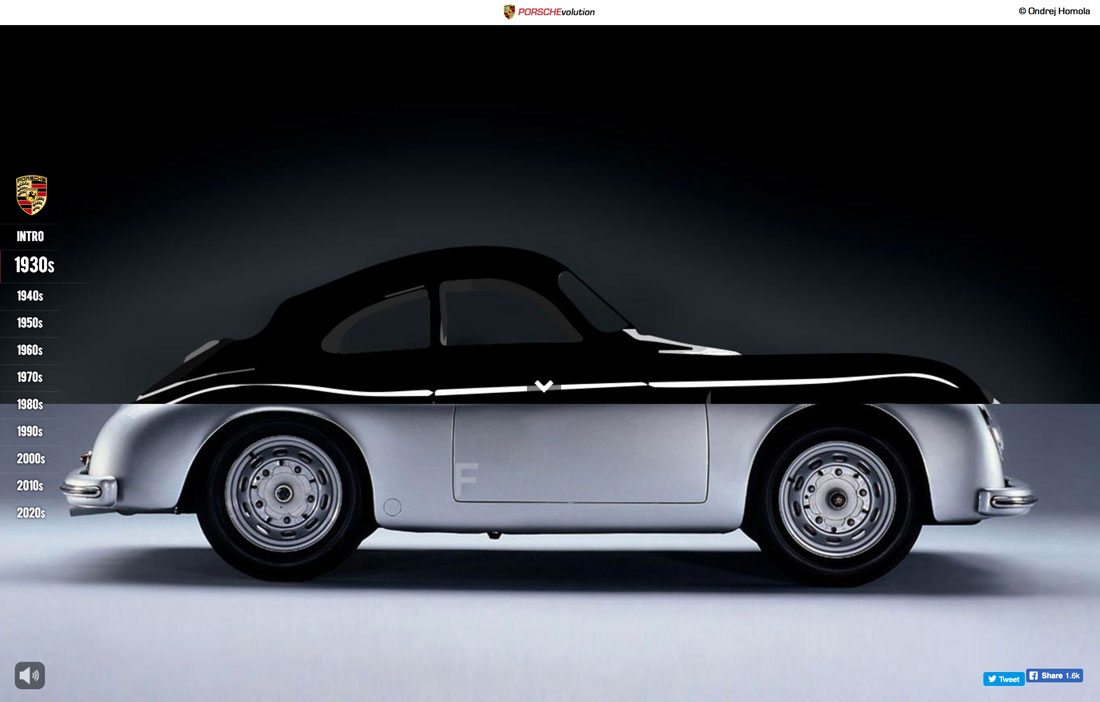 在上面 Porsche Evolution 這個網站當中,不同時代的保時捷車型隨著時間的變化而展現,背景的圖片場景也隨之變化,如果你仔細聽會發(fā)現音樂也會隨著年代的變化而演變。