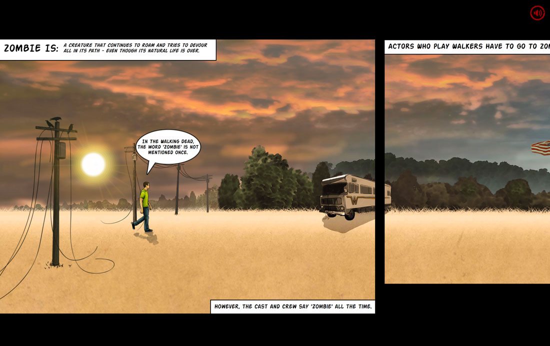 和其他的視差滾動的網頁設計不同,The Walking Dead Zombiefied 的頁面布局是橫向的,當用戶滾動頁面的時候,角色會隨著滾動,穿過不同的場景,劇情也隨之發(fā)展,頗為有趣。