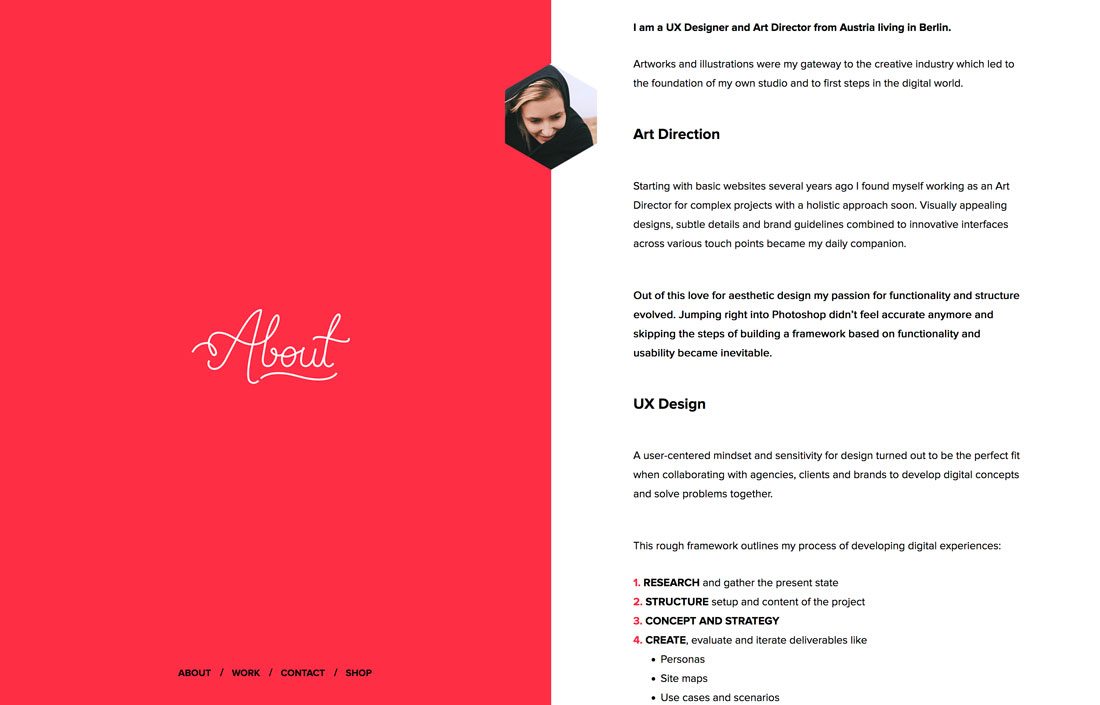 Melanie David 的這個個人頁面采用了單頁設計,她將頁面的一半用作導航,當你滾動的時候,頁面的一側不動,另一側會正常滾動,當你完成閱讀之后,會自然切換到下一個內容區(qū)塊。