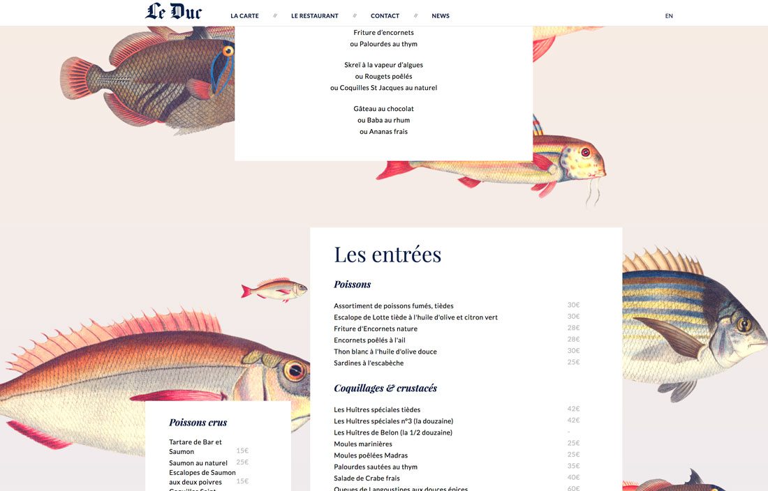 Le Duc 餐廳的網頁當中,設計師按照你的閱讀習慣和訂餐的方式,將菜單劃分為單獨的區(qū)塊。動畫很簡單,背景的魚起到了很好的裝飾性作用,用戶在瀏覽的時候,能夠更好地了解訂餐的信息。