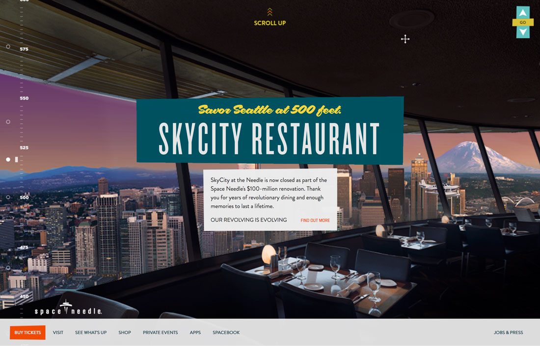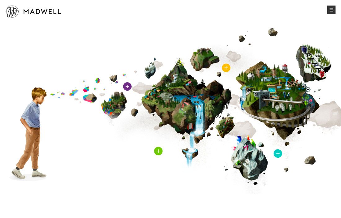 而 Seattle Space Needle 的視差特效則采用的是更為經典的設計,當用戶在瀏覽的時候會因為元素間不同的運動速度而產生擬真的瀏覽體驗。不過,這個網站的獨特之處在于,它是從下往上瀏覽的,非常有意思。當用戶通過網站的不同區(qū)塊到達頂端的餐廳區(qū)域的時候,會感受到這個餐廳所處的位置之高,城市的天際線和CTA元素結合到一起,讓你不會錯過關鍵的信息。這樣的設計是教育性的,也是冒險的,但是它確實創(chuàng)造了前所未有的體驗,令人難忘。越來越成熟的3D設計讓卡通和接近現實的設計元素的設計成本變得低廉,像上面 Madwell 這個網頁,這些風格接近卡通,但是視覺效果和形式感都極為突出的元素,在視差動效下產生了類似VR的視覺體驗。