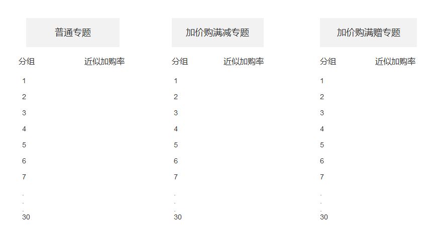 第一個(gè)專題為普通專題,將10個(gè)清倉產(chǎn)品與20個(gè)熱銷產(chǎn)品混合放置即可;第二個(gè)專題為加價(jià)購專屬專題,設(shè)定活動(dòng)方式為滿減,將10個(gè)清倉產(chǎn)品作為20個(gè)熱銷產(chǎn)品的加購商品;第三個(gè)專題也為加價(jià)購專屬專題,設(shè)定活動(dòng)方式為滿贈(zèng),將10個(gè)清倉產(chǎn)品作為20個(gè)熱銷產(chǎn)品的贈(zèng)品;然后針對(duì)三個(gè)專題每一個(gè)專題抽取30個(gè)獨(dú)立用戶分組,用戶群的用戶基數(shù)近似相等,用戶群轉(zhuǎn)化率相似,采用相同的推廣渠道,由于無法精確確定用戶數(shù)量,我們只需告知推廣保證每日每個(gè)專題劃分的每一個(gè)群組的流量保證在一個(gè)特定數(shù)量XXXX左右,持續(xù)兩周,最終得出每個(gè)用戶分組的以下數(shù)據(jù):從這個(gè)專題頁落地的用戶所下的訂單中,同時(shí)包含清倉產(chǎn)品與熱銷產(chǎn)品的訂單數(shù)/所有訂單數(shù),我們給它起個(gè)名字叫近似加購率(因?yàn)榧词乖诩觾r(jià)購專題里清倉產(chǎn)品和熱銷產(chǎn)品在一起也不一定就是參加加購活動(dòng)加購的)。用圖表展現(xiàn)就是這樣: