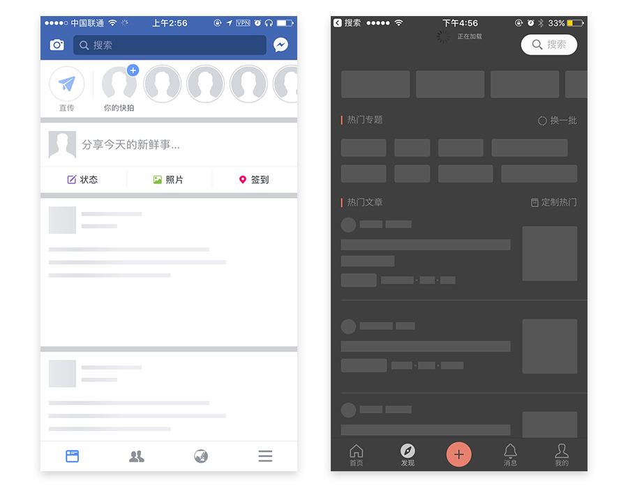 這種形式一般用于內(nèi)容框架固定的頁面,如果頁面可能會出現(xiàn)空數(shù)據(jù)的情況也不宜使用。像下圖的Facebook首頁,簡書的首頁和發(fā)現(xiàn)頁,頁面結(jié)構(gòu)固定,且內(nèi)容不會為空(除非網(wǎng)絡(luò)異常導(dǎo)致加載失敗),就很適合用Skeleton Screen的加載形式。配合前面講的優(yōu)先加載的方式,效果會更佳。