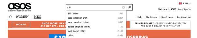 asos在用戶打字時展示了搜索建議,他們甚至更進了一步,展示每個搜索關(guān)鍵詞將返回的搜索結(jié)果數(shù)量