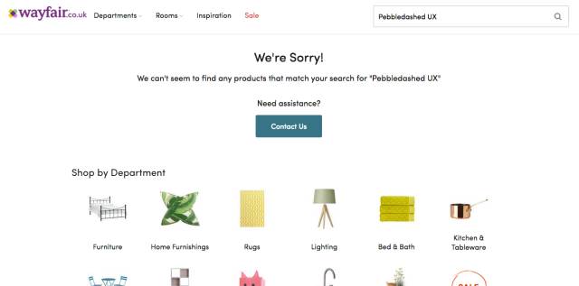 Wayfair網(wǎng)站在搜索無結(jié)果頁面提供了一個非常明顯的“聯(lián)系我們”按鈕