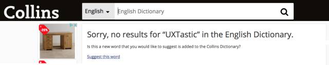 Collins的在線詞典在“搜索無結(jié)果”頁面也將失敗的搜索變?yōu)闄C會,讓用戶可以將該詞匯推薦到下一次的詞典更新中。