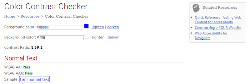 你可以使用WebAIM的[色彩對(duì)比度檢測(cè)器](http://webaim.org/resources/contrastchecker/)來(lái)確定是否處于最佳范圍內(nèi)。