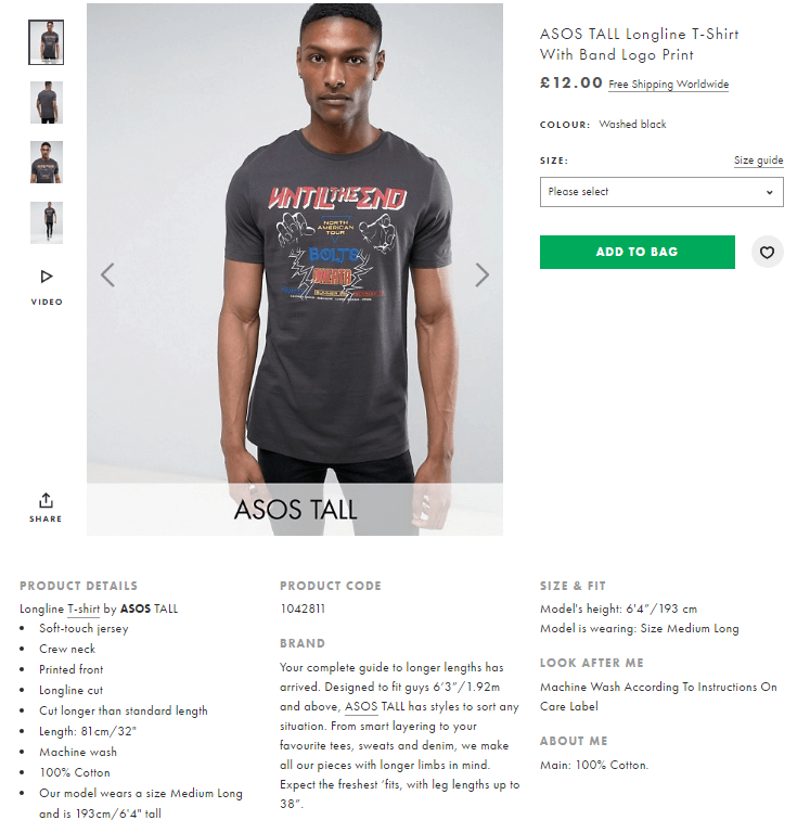 第二個(gè)例子來(lái)自ASOS。同樣銷(xiāo)售T恤的頁(yè)面為該商品提供了準(zhǔn)確的替代文字。 這有助于使用屏幕閱讀器的人想象商品的外觀(guān)。