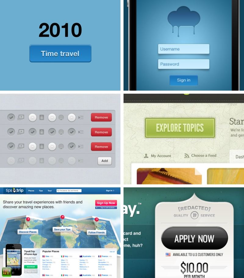 2009 年,因特網(wǎng)要慶祝 40 周歲,第一個種類出現(xiàn)在Dribbble。按鈕設(shè)計以灰色為主導(dǎo),幾乎都是用微妙的漸變、 圓角和陰影構(gòu)成。