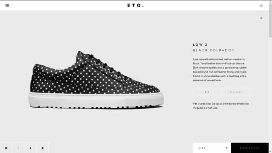 上面展示的ETQ網(wǎng)站,利用了負(fù)空間將視線引向所陳列的產(chǎn)品。頁面底部對比鮮明的黑白色塊,讓用戶選擇尺寸或查看商品價格。