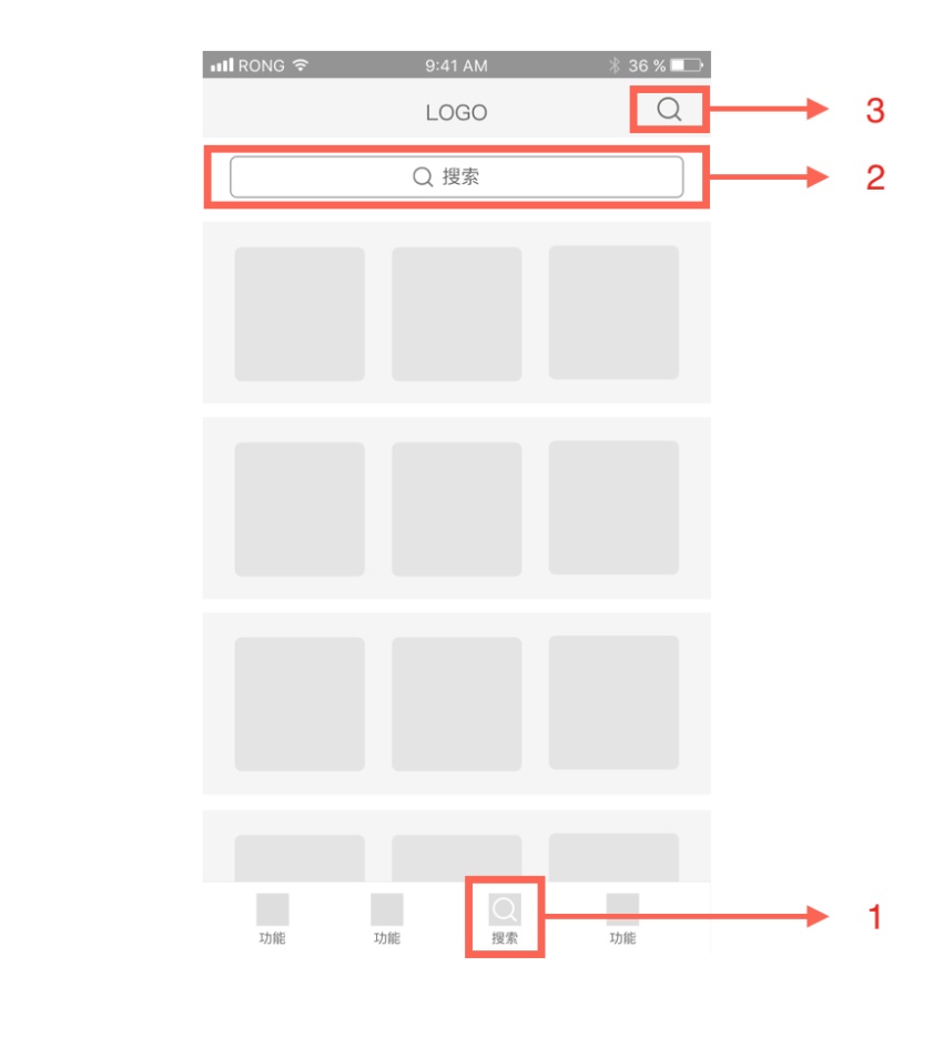 如上圖中「2」的位置。 任務(wù)型應(yīng)用通常使用搜索框形式,這種設(shè)計(jì)方式占據(jù)了足夠的屏幕寬度,一般放在屏幕的核心位置,通常會(huì)在頁面頂部位置出現(xiàn),用戶對此一目了然,可以快速點(diǎn)擊搜索。