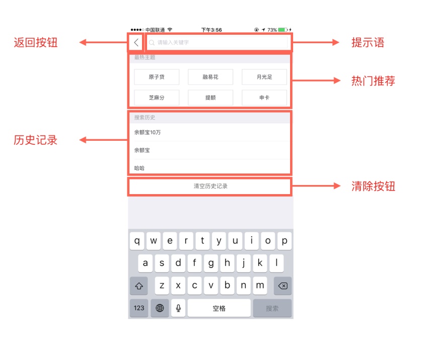 這個(gè)頁面簡單的來說,就是用戶點(diǎn)擊搜索按鈕,頁面立即彈起的一個(gè)過渡頁面。由提示語、返回按鈕、歷史記錄、熱門推薦、清除按鈕這些基本功能組成。但當(dāng)我們滿足這些基本功能點(diǎn)時(shí),如何讓搜索中間頁的設(shè)計(jì)更加貼心呢?