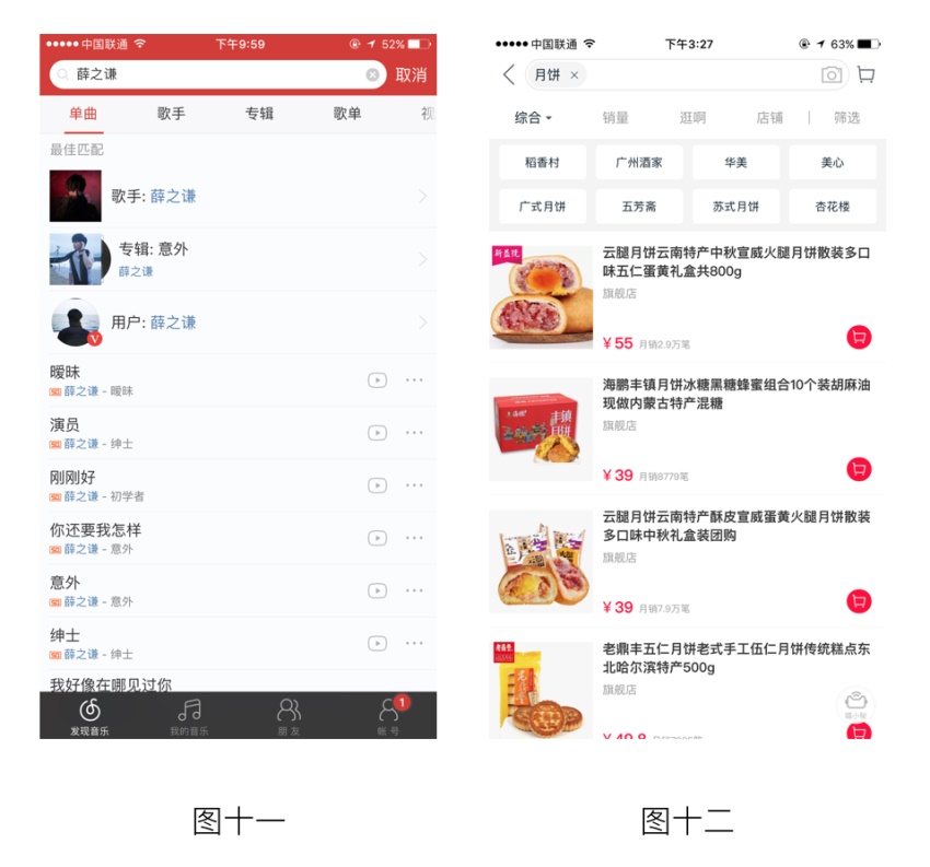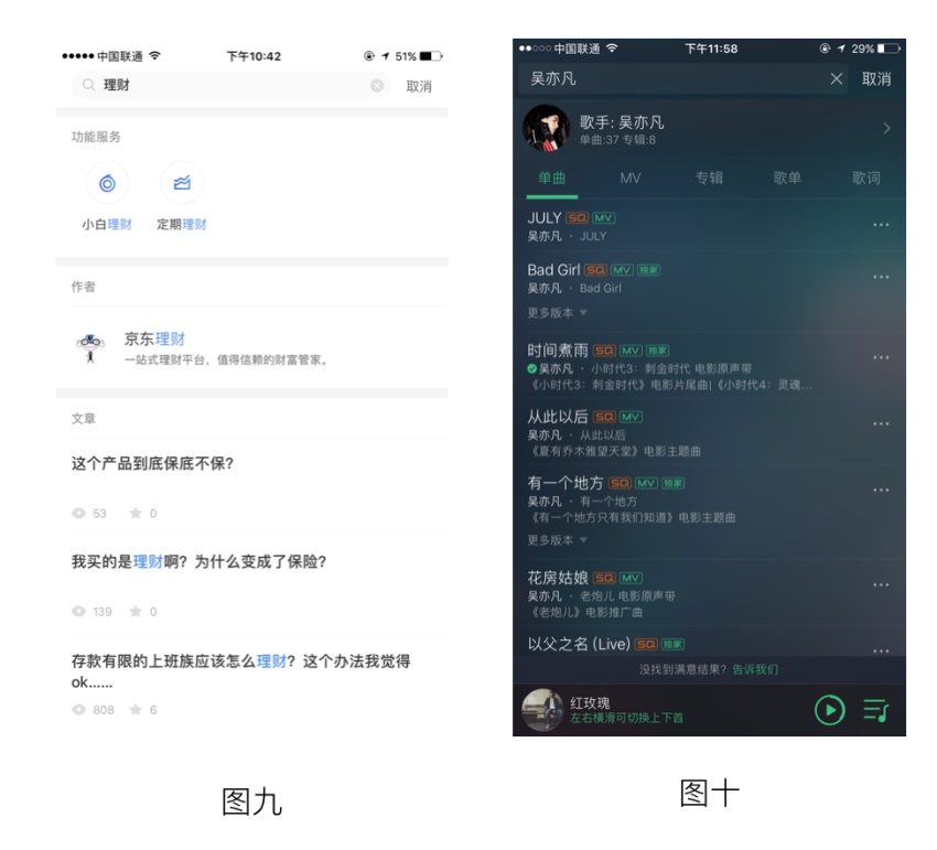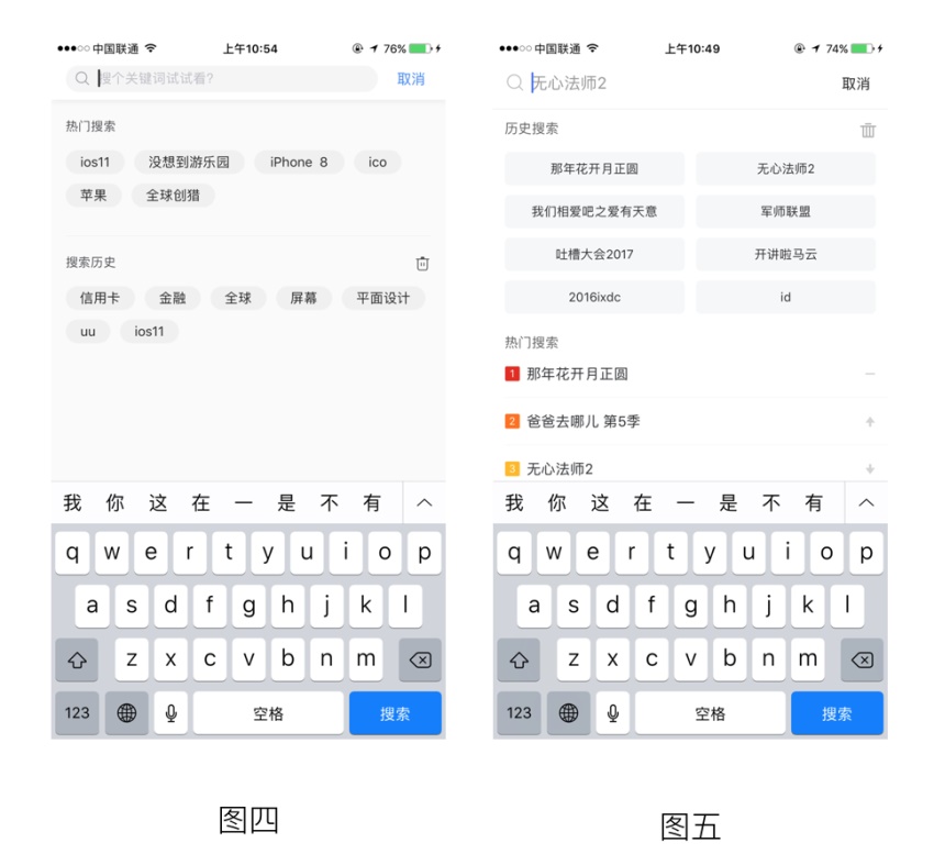 如圖四、圖五,歷史記錄可以有效的減少用戶對重復(fù)性內(nèi)容的不必要操作,呈現(xiàn)用戶的搜索歷史。根據(jù)認(rèn)知心理學(xué)中的相似律,搜索框通常位于頁面頂部,歷史記錄緊貼搜索框展示,此時(shí)用戶的視覺焦點(diǎn)在這里,更容易注意到,也不會(huì)產(chǎn)生認(rèn)知偏差,因此該位置要避免被其他信息模塊占據(jù)從而割裂二者的聯(lián)系。同時(shí)對不同模塊在樣式上做點(diǎn)區(qū)別,更好的幫用戶區(qū)分模塊間的區(qū)別。