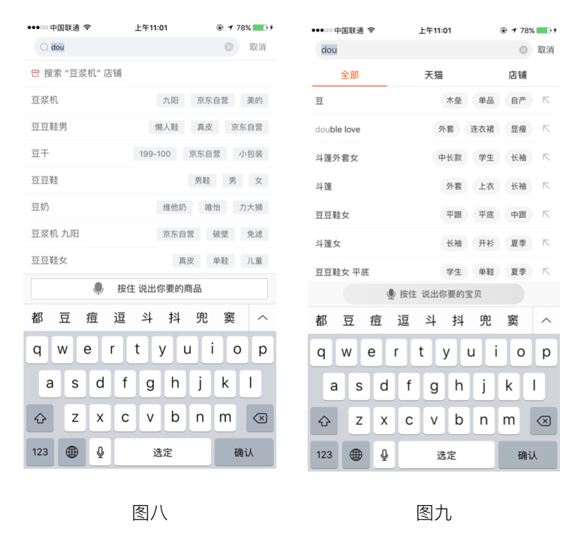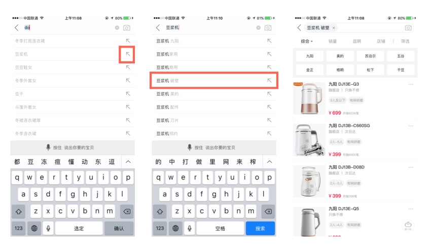 在輸入關(guān)鍵字時(shí),搜索框下方會(huì)出現(xiàn)一系列的聯(lián)想,而在點(diǎn)擊某條聯(lián)想右邊的箭頭后,我們會(huì)發(fā)現(xiàn)該聯(lián)想進(jìn)入搜索框并引發(fā)了又一系列的聯(lián)想,選擇最終確認(rèn)詞條,點(diǎn)擊搜索按鈕到達(dá)結(jié)果頁。整個(gè)過程可以讓用戶快速精準(zhǔn)的到達(dá)搜索結(jié)果頁,避免輸入過程中出現(xiàn)錯(cuò)誤輸入,最終提升產(chǎn)品轉(zhuǎn)化率。