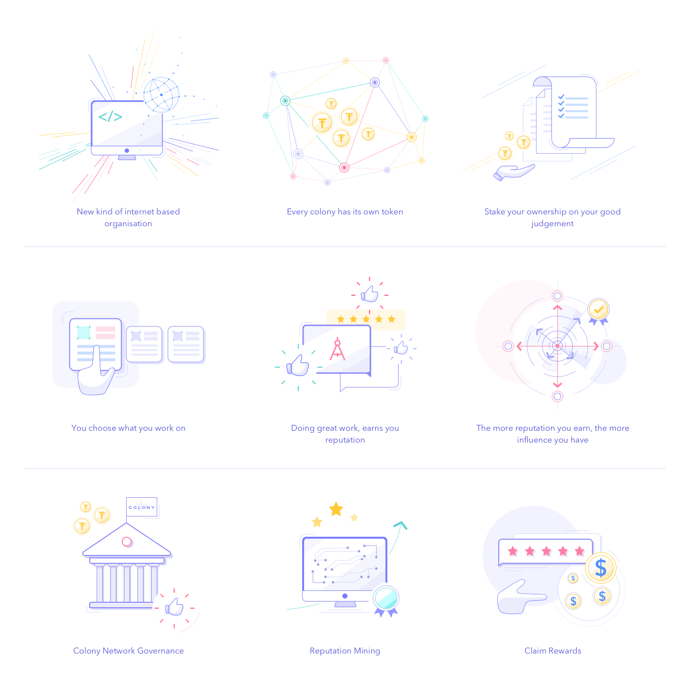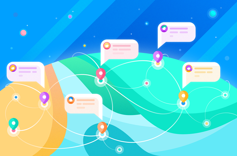 設計師們拿出了不同風格的插畫,它們在主題上和整個UI保持一致,營造出友好、平易近人的氛圍,同時也讓人對整個公司形象產生足夠的好感。插畫中展示出 Colony 是如何幫助世界各地的用戶溝通、交流、達成目標的。