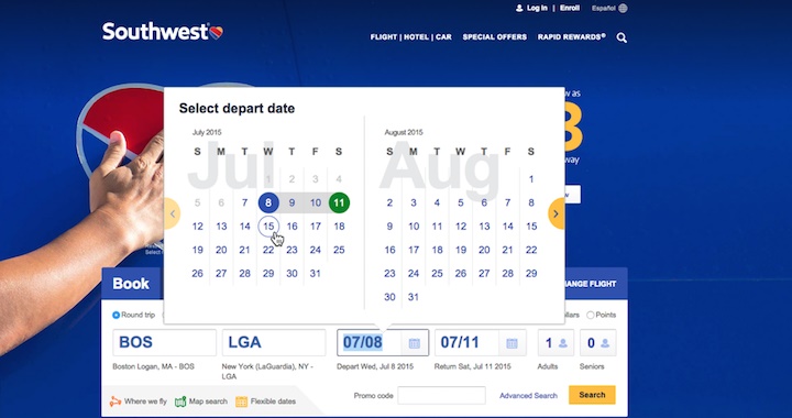 △ 西南航空網(wǎng)站前端設(shè)計(jì)的航班日期選擇界面
