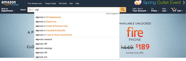 對(duì)于用戶來說,記住「Etymotic」這個(gè)耳機(jī)名字,然后輸入到搜索框中搜索,是一件很難的事情。亞馬遜的可點(diǎn)擊搜索建議可以在減少用戶的輸入量,降低他們犯錯(cuò)的風(fēng)險(xiǎn)。