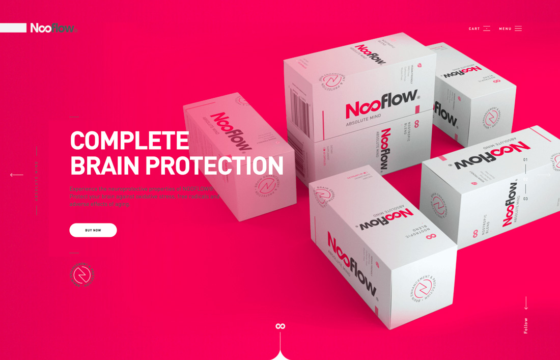值得注意的是,留白并不一定是白色的,比如Nooflow 這個(gè)網(wǎng)站,留白和背景就是紅色的,不過這同樣創(chuàng)造了令人驚嘆的視覺效果。