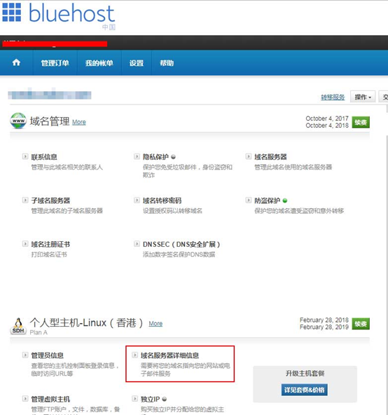 ?。?)登錄BlueHost賬戶,找到“域名服務(wù)器詳情”并點(diǎn)擊進(jìn)入界面。