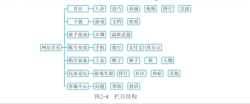 玩家論壇:主要展現(xiàn)玩家們的建議、論壇以及玩家動(dòng)態(tài)排行??头行模褐饕鉀Q玩家在游戲過(guò)程中的困難。提供幫助,以及必要的投訴糾紛。為了使以后網(wǎng)站的開(kāi)發(fā)和建設(shè)條理分明,要制定一個(gè)網(wǎng)站的結(jié)構(gòu)示意圖。在結(jié)構(gòu)示意圖中需要明確每個(gè)一級(jí)欄目及其相應(yīng)的二級(jí)欄目和分支,并確定其相關(guān)的內(nèi)容。這個(gè)結(jié)構(gòu)圖日后還可能作為網(wǎng)站導(dǎo)航圖放到網(wǎng)站上,供瀏覽者快速了解網(wǎng)站的結(jié)構(gòu),欄目結(jié)構(gòu)如圖2-4所示