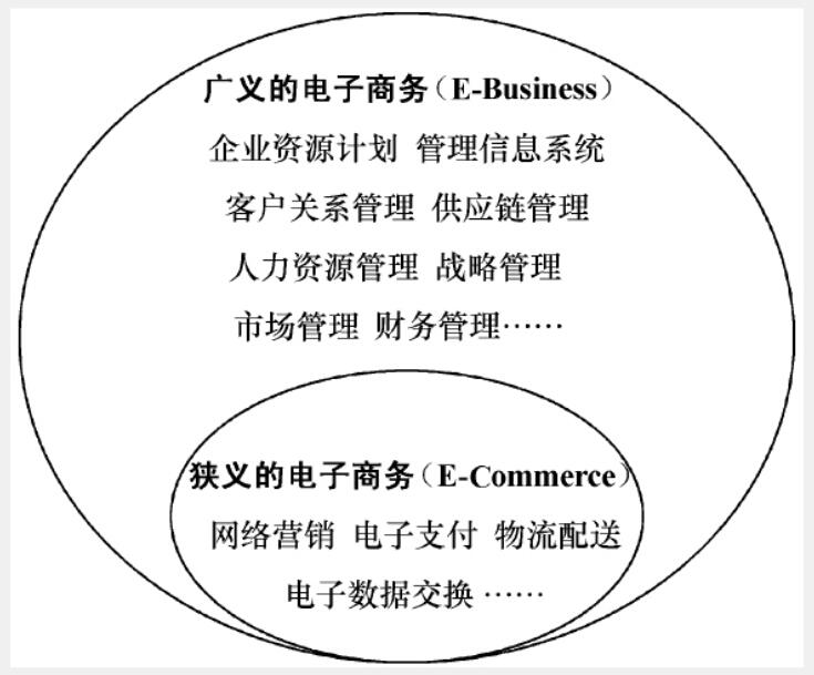 狹義的電子商務(wù)((Electronic Commerce,E-Commerce)僅指在互聯(lián)網(wǎng)上開展的交易或與交易有關(guān)的活動。廣義的電子商務(wù)((Electronic Business,E-Business)是指利用信息技術(shù)使整個商務(wù)活動實現(xiàn)電子化,包括利用互聯(lián)網(wǎng)、內(nèi)聯(lián)網(wǎng)(Intranet)、外聯(lián)網(wǎng)(Extranet)等不同形式的網(wǎng)絡(luò)。它不僅包括企業(yè)商務(wù)活動中面向外部的業(yè)務(wù)流程,如網(wǎng)絡(luò)營銷、電子支付、物流配送等,還包括面向企業(yè)內(nèi)部的業(yè)務(wù)流程,如企業(yè)資源計劃(Enterprise Resource Planning,ERP)、管理信息系統(tǒng)(Management Information System,MIS)、客戶關(guān)系管理(CustomerRelationship Management,CRM)、供應(yīng)鏈管理(Supply ChainManagement,SCM)、人力資源管理(Human Resource Management,HRM)、戰(zhàn)略管理(Strategy Management)、市場管理、生產(chǎn)管理、研發(fā)管理及財務(wù)管理等內(nèi)容,如圖1.1所示。