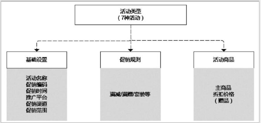 如圖4-1所示。這三部分內(nèi)容缺一不可,基礎(chǔ)設(shè)置包含了促銷活動(dòng)的一些基本信息;促銷規(guī)則確定了促銷的計(jì)算規(guī)則;活動(dòng)商品圈定了促銷活動(dòng)范圍。