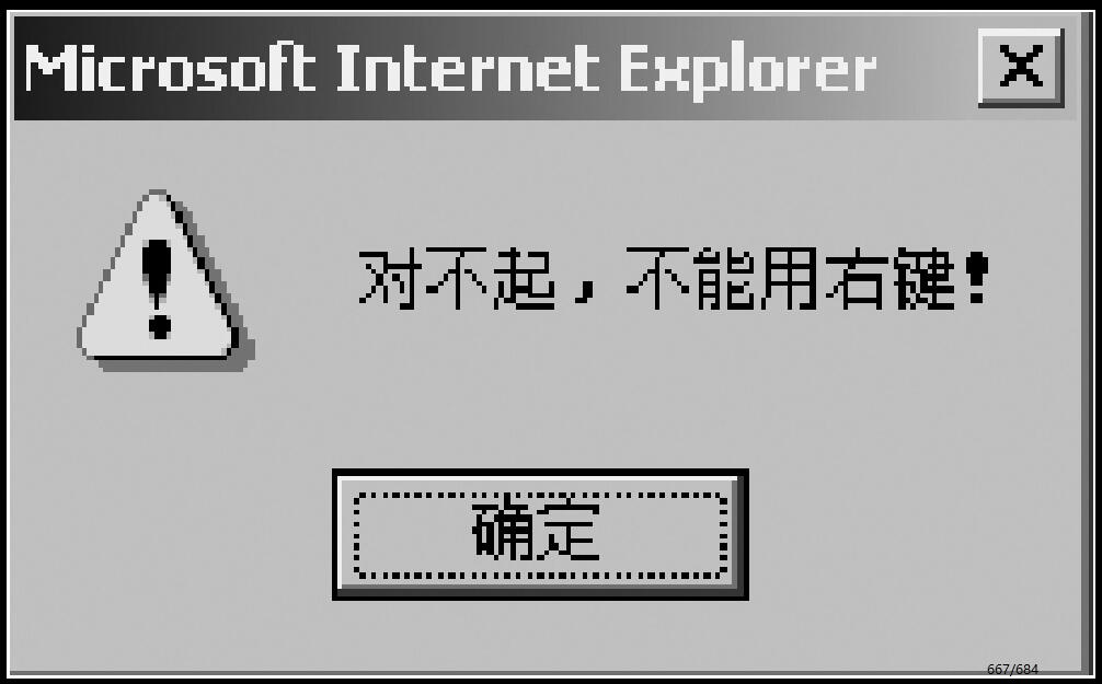 (2)屏蔽鼠標右鍵。在所需保護的頁面文件(上例中為index.html文件)中加入以下代碼(當右鍵被單擊時將出現(xiàn)圖9-1所示提示框)。