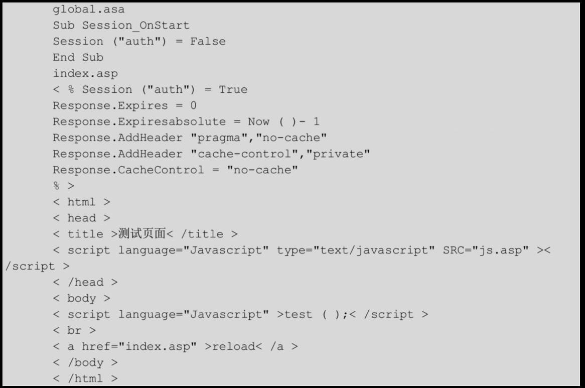 這個案例涉及三個文件:index.asp,js.asp以及global.asa。global.asa定義了一個auth會話變量,該變量用于驗證請求JavaScript源文件的頁面起源是否合法。這里選擇使用會話變量的原因在于它使用起來比較方便。