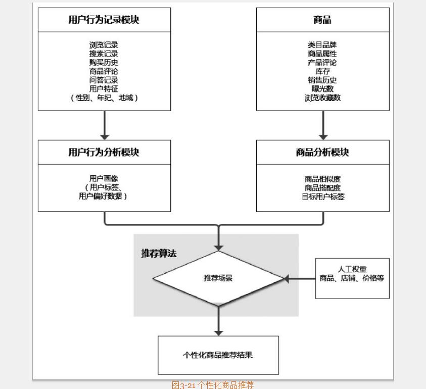 網(wǎng)站制作公司提醒電商推薦系統(tǒng)將收集的用戶信息、產(chǎn)品信息及用戶畫像分類作為系統(tǒng)輸入,利用適當(dāng)?shù)耐扑]算法和推薦方式,根據(jù)用戶設(shè)定的個(gè)性化程度和信息發(fā)送方式,給用戶提供個(gè)性化商品推薦。用戶對(duì)推薦結(jié)果的點(diǎn)擊瀏覽、購買的反饋結(jié)果,又可以作為優(yōu)化系統(tǒng)推薦的參考。網(wǎng)站制作公司認(rèn)為完善的推薦系統(tǒng)一般由四部分組成,按照“采集”、“分析”、“推薦”的步驟,分為四大模塊:采集用戶信息的用戶行為記錄模塊、分析用戶喜好的用戶行為分析模塊、分析商品特征的商品分析模塊,以及推薦算法模塊。用戶行為記錄模塊負(fù)責(zé)采集能反映用戶喜好的行為,例如瀏覽、購買、評(píng)論、問答等;用戶行為分析模塊通過用戶的行為記錄,分析用戶對(duì)商品的潛在喜好及喜歡程度,建立用戶偏好模型;商品分析模塊主要對(duì)商品進(jìn)行商品相似度、商品搭配度、目標(biāo)用戶標(biāo)簽進(jìn)行分析;推薦算法根據(jù)一定的規(guī)則從備選商品集合中篩選出目標(biāo)用戶最可能感興趣的商品進(jìn)行推薦。個(gè)性化商品推薦的圖示結(jié)構(gòu)如圖3-21所示。