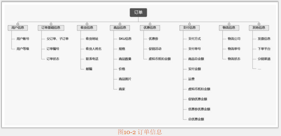 如圖10-2所示,在存儲(chǔ)的訂單信息中,主要包含以下內(nèi)容:用戶信息、訂單基礎(chǔ)信息、收貨信息、商品信息、優(yōu)惠