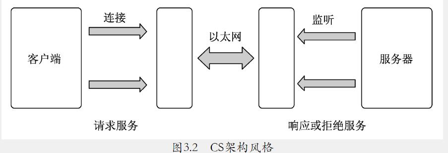 通過上述內(nèi)容可以看出,CS架構(gòu)風(fēng)格的定義很簡潔,事實上大部分架構(gòu)風(fēng)格的定義都很簡潔。CS架構(gòu)風(fēng)格只是定義了客戶端和服務(wù)器交互方式的規(guī)則和約束,約束了客戶端請求服務(wù)器前必須連接服務(wù)器,同時服務(wù)器通過監(jiān)聽網(wǎng)絡(luò)提供服務(wù),當(dāng)接收到客戶端的請求時,服務(wù)器會根據(jù)請求內(nèi)容響應(yīng)或者拒絕服務(wù)請求,如圖3.2所示。