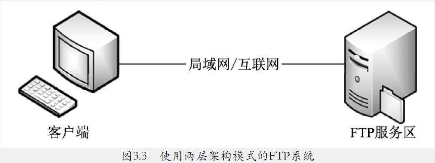 CS架構(gòu)風(fēng)格將系統(tǒng)分為客戶端和服務(wù)器兩個應(yīng)用,并且服務(wù)的請求和響應(yīng)都是通過通信實現(xiàn)的。CS架構(gòu)風(fēng)格被大量地應(yīng)用于軟件產(chǎn)品中,在實現(xiàn)CS架構(gòu)風(fēng)格時根據(jù)實際需求和條件會有所差別。其中最常見的是兩層架構(gòu)模式(2-Tier),即把服務(wù)器和客戶端分別部署在兩個物理層(工作站和服務(wù)器主機)上,然后通過局域網(wǎng)或以太網(wǎng)把兩個物理層連接起來。這種架構(gòu)模式的典型應(yīng)用是FTP (FileTransfer Protocol)系統(tǒng),如圖3.3所示。