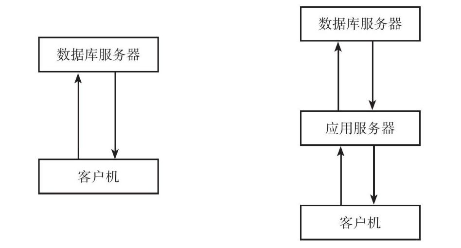 客戶機/服務(wù)器(C/S)模式主要是由承擔人機界面顯示和數(shù)據(jù)業(yè)務(wù)操作等的客戶機和承擔數(shù)據(jù)管理任務(wù)的數(shù)據(jù)庫服務(wù)器組成,它實現(xiàn)了分布式計算模式,數(shù)據(jù)集中管理和業(yè)務(wù)處理。對于某些客戶機提出的較為復(fù)雜的服務(wù)請求,為了降低數(shù)據(jù)庫服務(wù)器的壓力,在兩層的C/S模式基礎(chǔ)上,引入應(yīng)用服務(wù)器進行相關(guān)信息的處理,數(shù)據(jù)庫服務(wù)器主要承擔數(shù)據(jù)管理任務(wù),從而出現(xiàn)了C/S的三層結(jié)構(gòu)。C/S模式的兩種結(jié)構(gòu)如圖4-7所示。