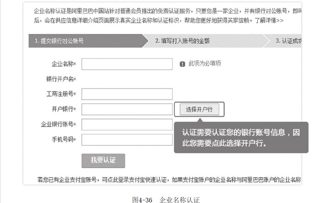 圖4-34 阿里巴巴官方網(wǎng)站首頁服裝企業(yè)在阿里巴巴第三方平臺構(gòu)建網(wǎng)站的開店準備工作還包括企業(yè)名稱認證、綁定支付寶、千牛工作平臺的安裝等工作。本階段的操作過程可以參考圖4-35所示內(nèi)容,