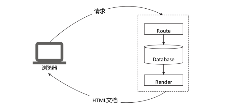 傳統(tǒng)網(wǎng)站的渲染流程是由瀏覽器主動發(fā)起請求,然后服務(wù)器端生成HIL文檔后發(fā)送響應(yīng)給瀏覽器,瀏覽器接到響應(yīng)后將HTL文檔渲染為可視網(wǎng)頁。這是自瀏覽器發(fā)明以來就沿用至今的渲染流程。這種工作模式的優(yōu)點(diǎn)是節(jié)省客戶端資源,在客戶終端設(shè)備以及瀏覽器性能普遍比較落后的情況下能夠保證良好的渲染效果,并且服務(wù)器端渲染的網(wǎng)頁更利于SEO(Search Engine Optimization,搜索引擎優(yōu)化)。而其缺點(diǎn)是每訪問一個頁面都要發(fā)起請求,每個請求都需要服務(wù)器進(jìn)行路由匹配、數(shù)據(jù)庫查詢、生成HTML文檔后再發(fā)送響應(yīng)給瀏覽器,這個過程會消耗服務(wù)器的大量計算資源,如圖3所示。