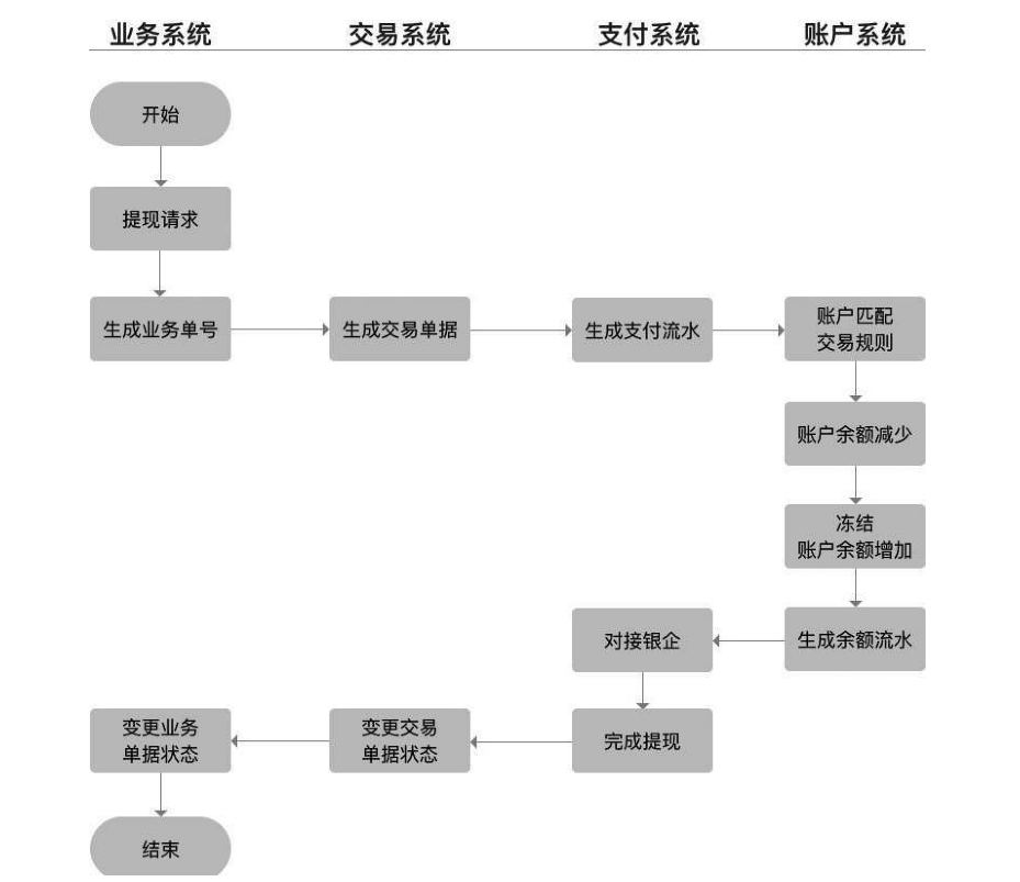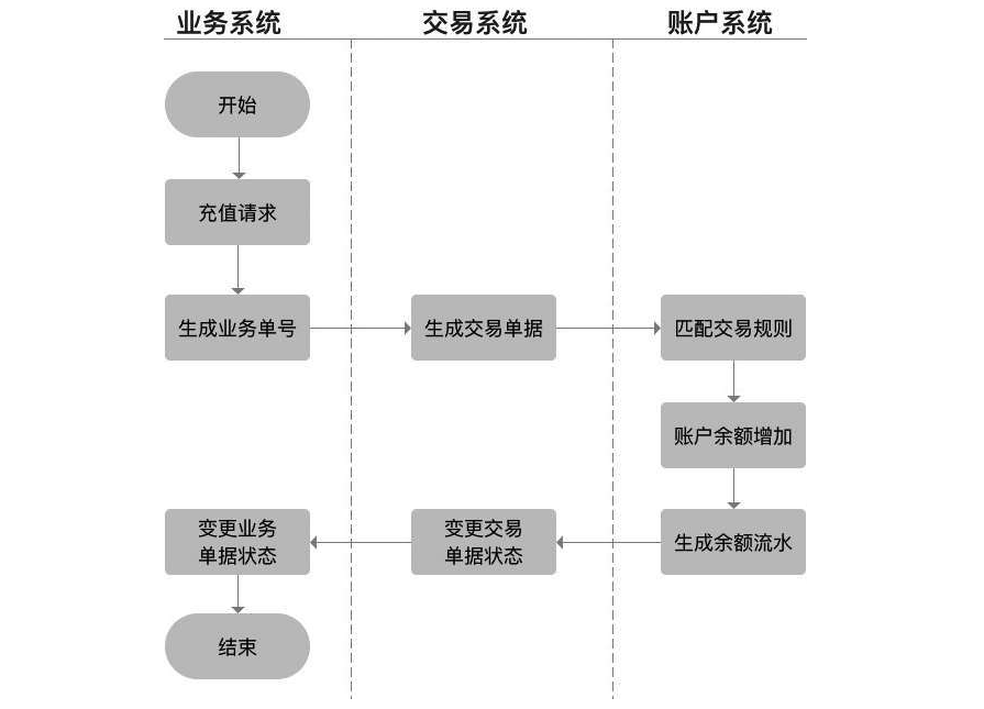按照流程先生成對(duì)應(yīng)的業(yè)務(wù)單據(jù),然后提交給交易系統(tǒng)進(jìn)行交易單據(jù)流水的生成,賬戶系統(tǒng)根據(jù)交易系統(tǒng)提供的單據(jù),按照規(guī)則進(jìn)行增加余額的操作,完成后通知上游系統(tǒng)變更狀態(tài)。