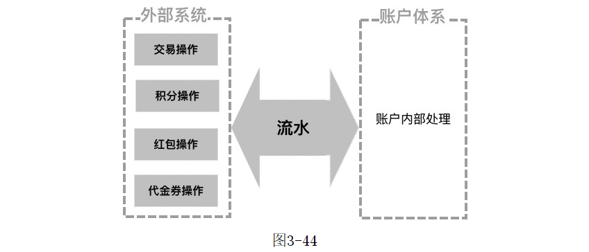 ●代金券賬戶:記錄用戶擁有代金券的使用情況。所有的資產(chǎn)流動(dòng)都是對(duì)賬戶的操作,而進(jìn)出的記錄就是叫作流水。外部系統(tǒng)根據(jù)業(yè)務(wù)場(chǎng)景發(fā)生消費(fèi)用戶資產(chǎn)的行為,該行為會(huì)以流水的方式記錄下來(lái),提交給賬戶體系,賬戶進(jìn)行結(jié)算后入賬并更新用戶資產(chǎn),如圖3-44所示。