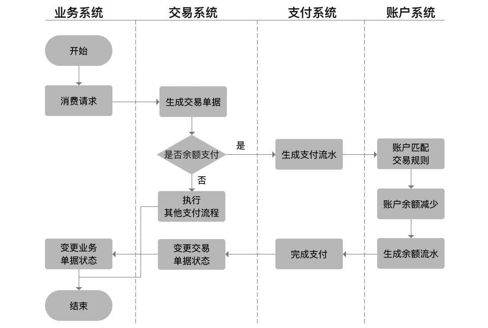 主要涉及的系統(tǒng)包括相關(guān)業(yè)務(wù)系統(tǒng)(如用戶端下單)、交易系統(tǒng)(計(jì)算支付金額和方式)、支付系統(tǒng)(完成支付過(guò)程)和賬戶系統(tǒng)(完成余額的消費(fèi))等。業(yè)務(wù)系統(tǒng)根據(jù)業(yè)務(wù)場(chǎng)景發(fā)起消費(fèi)請(qǐng)求;交易系統(tǒng)根據(jù)情況判斷是否需要使用余額支付;支付系統(tǒng)生成交易對(duì)應(yīng)的支付流水并和賬戶進(jìn)行交互;賬戶按照要求和規(guī)則進(jìn)行扣減,扣減完畢后告知狀態(tài)并由支付和交易系統(tǒng)更新單據(jù)狀態(tài)。
