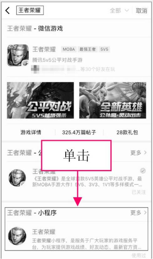 “王者榮耀”搜索結(jié)果界面,在搜索結(jié)果中,單擊小程序版塊的選項,便可以直接進入目標小程序的首頁,如圖2-18所示。