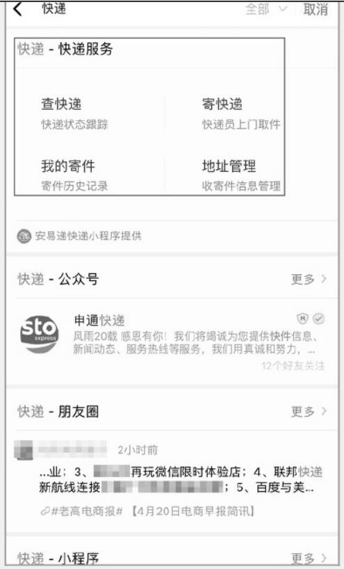 為搜索“快遞”的相關(guān)結(jié)果。從圖中不難看出,在該界面中顯示了“快遞─快遞服務(wù)”—欄。