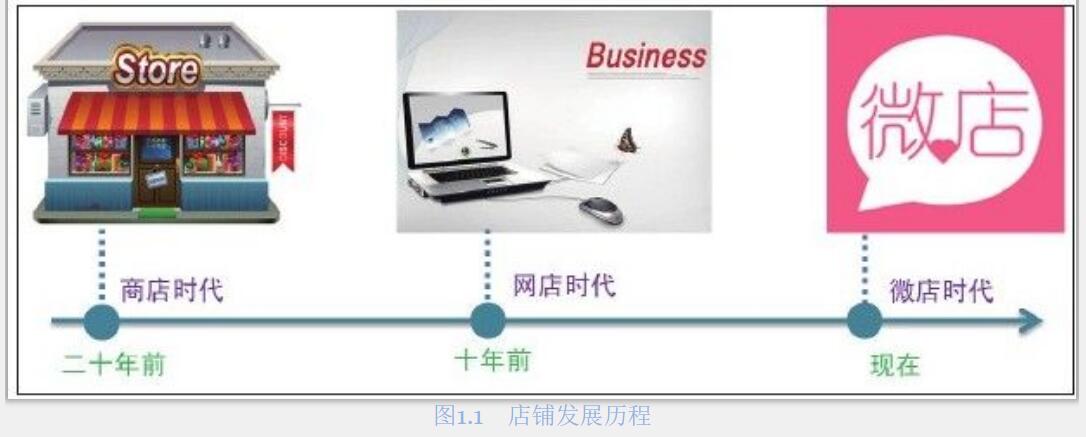 有人曾總結(jié)了我國(guó)近二十年的“店鋪歷程”:二十年前,“商店時(shí)代”造就了百億“國(guó)美”與“蘇寧”;十年前,“網(wǎng)店時(shí)代”造就了千億“淘寶天貓”“京東”;如今,“微店時(shí)代”來(lái)臨了。店鋪發(fā)展的歷程如圖1.1所示。