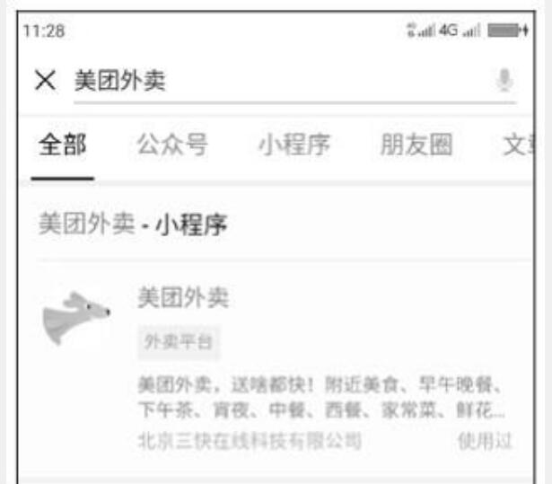 由于微信的產(chǎn)品定位,使它不僅僅是一個即時通信的工具,而是發(fā)展成了一個服務(wù)的平臺,用戶在微信中就能完成訂票、打車、訂餐等服務(wù)。在小程序出現(xiàn)之前,這些服務(wù)是通過公眾平臺中的服務(wù)號來完成的,但是由于服務(wù)號的功能薄弱,不能滿足需求,所以小程序就誕生了。相比原生APP,微信小程序有著天然的優(yōu)勢,即微信的用戶量非常大,是互聯(lián)網(wǎng)的流量入口之一,微信小程序可以更快速地獲取用戶,并且能被附近用戶搜索到,能結(jié)合公眾平臺來推廣等。微信小程序自推出以后就大受歡迎。根據(jù)微信公開課2o18年7月公布的數(shù)據(jù),小程序的上線數(shù)量已超過10o萬,開發(fā)者也增加到15o萬人,小程序的用戶突破6億,日活躍用戶數(shù)量達(dá)到1.7億,覆蓋了教育、媒體、交通、房地產(chǎn)、旅游、電商、餐飲等多個領(lǐng)域。由于微信小程序操作簡單、使用方便,一些熱門的原生APP也發(fā)布了小程序版本,如京東購物、美團(tuán)外賣、摩拜單車、鏈家租房等。若要打開一個微信小程序,可以通過搜索關(guān)鍵詞、掃描二維碼、群分享、好友分享等途徑來實現(xiàn)。例如,單擊微信中的搜索按鈕,輸入關(guān)鍵詞“美團(tuán)外賣”,可以查找與其相關(guān)的公眾號、小程序、文章等,如圖1-2所示。