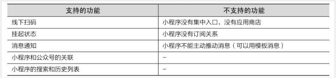 微信小程序方便、快捷的特點,給用戶的使用帶來很大便利。另外,微信團(tuán)隊考慮到小程序的產(chǎn)品定位,對于小程序支持和不支持的功能進(jìn)行了界定,如表1-1所示。