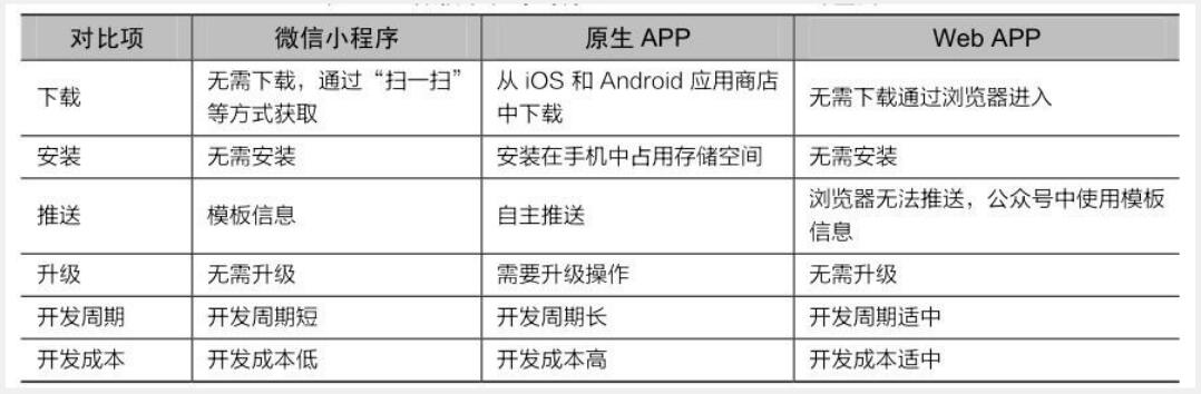表1-3微信小程序與原生APP、Web APP的區(qū)別